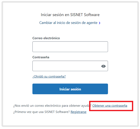 Ingresando allí se abre una ventana (imagen de abajo) donde deberá ingresar (si es la primera vez) a “obtener una contraseña” (como queda marcada en cuadro rojo) siempre que Uds. ya haya reportado anteriormente incidentes por email a soporte@sisnet.com.uy